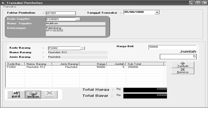 Digunakan untuk mencatat dan melihat data-data pembelian dari supplier. Untuk melakukan pilihan ini adalah dengan cara mengklik pada input data transaksi pembelian dari menu utama, kemudian akan tampil sub menu didalamya. Pada menu pembelian terdapat sejumlah fields yang harus diisi. Tampilan form data pembelian s